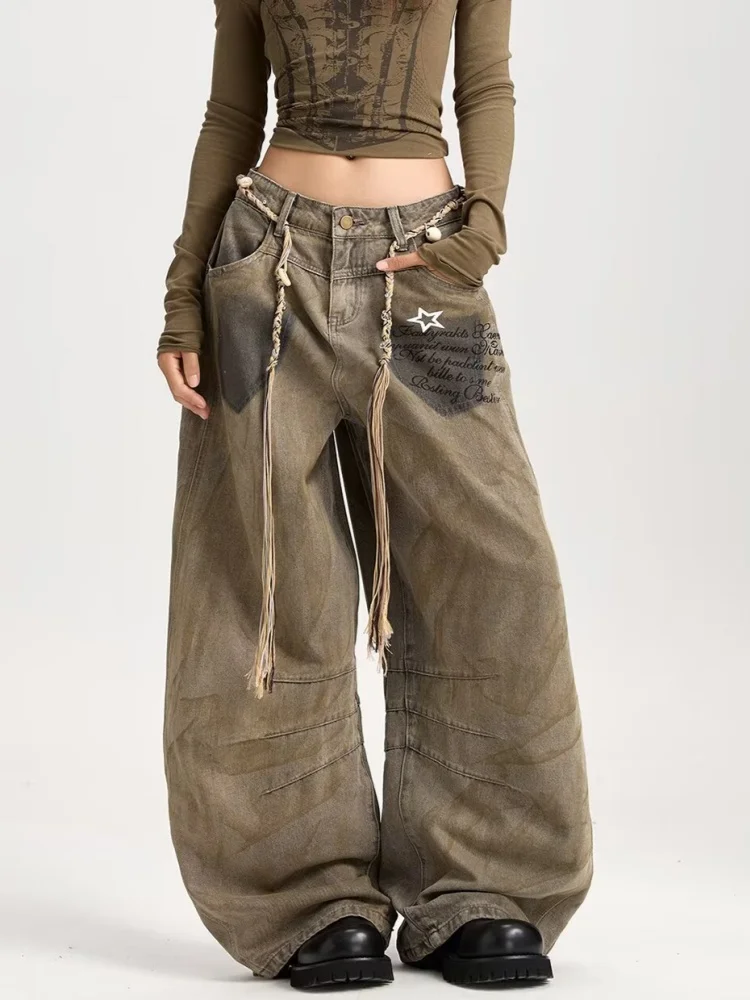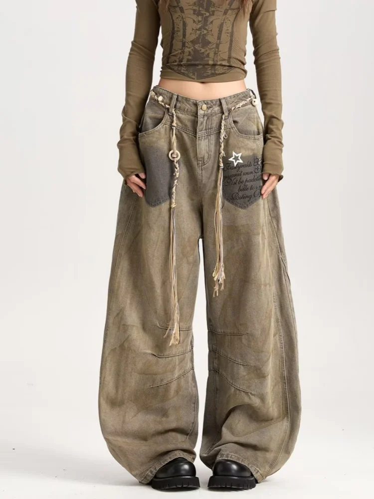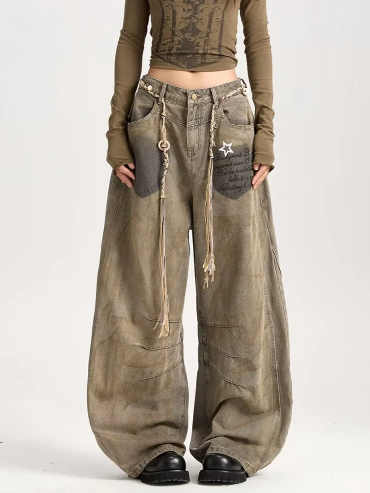 2025 American Retro Y2K Style Distressed Khaki Baggy Pleated Women's Jeans Pants Woman Clothing Wide Leg Cotton Long Trousers